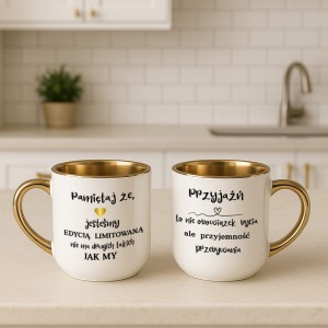 Kubek elegant szeroki biały - „Pamiętaj, że jesteśmy edycją limitowaną – nie ma drugich takich jak my / Przyjaźń to nie obowiązek bycia, ale przyjemność przebywania” – personalizacja imieniem 400 ml
