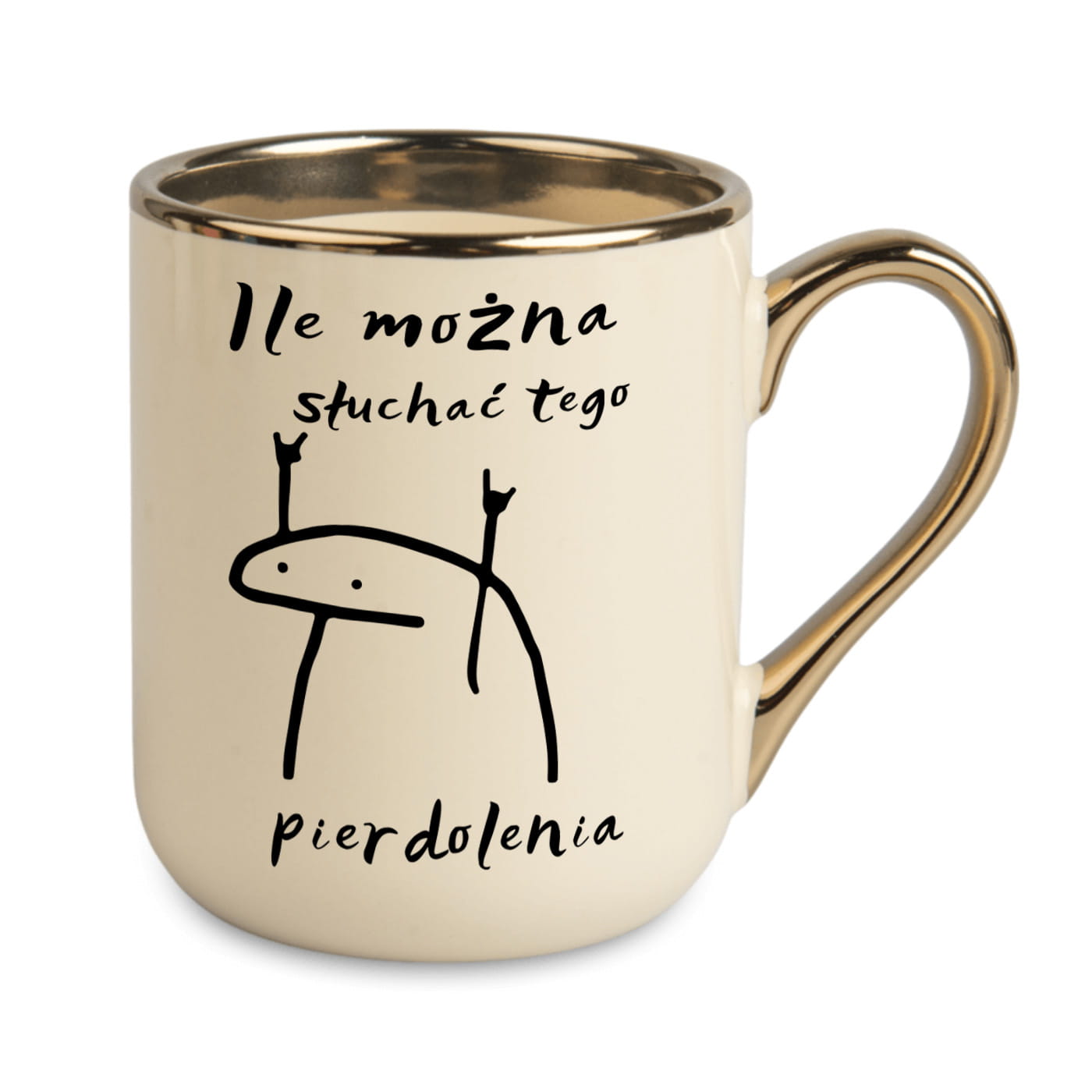 Kremowy kubek ze złotym wykończeniem to idealne połączenie delikatności i bezkompromisowego poczucia humoru. Jego stonowany odcień świetnie kontrastuje z wyrazistymi, czarnymi napisami, dzięki czemu każdy szczegół grafiki jest doskonale widoczny.