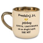Podaruj coś więcej niż zwykły kubek – podaruj emocje zamknięte w stylowej ceramice. Nasz kremowy kubek o pojemności 400 ml to połączenie minimalizmu, elegancji i wyjątkowego przekazu. Błyszczące złote ucho i rant dodają mu klasy, a nadruki po lewej i prawej stronie kubka niosą piękne przesłania o przyjaźni, bliskości i wyjątkowości relacji.