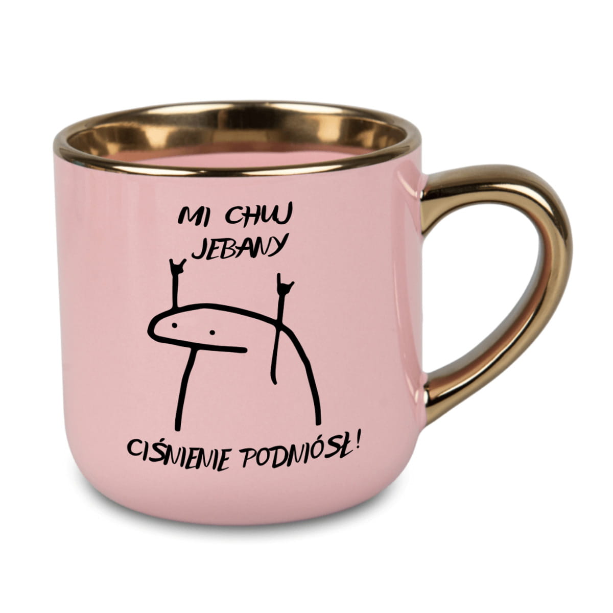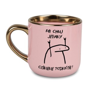 Różowy, błyszczący kubek z złotym uchem i rantem, z nadrukiem „Mi chuj jebany ciśnienie podniósł” i charakterystyczną grafiką, to prezent idealny dla osób z ciętym językiem i poczuciem humoru na najwyższym poziomie.
