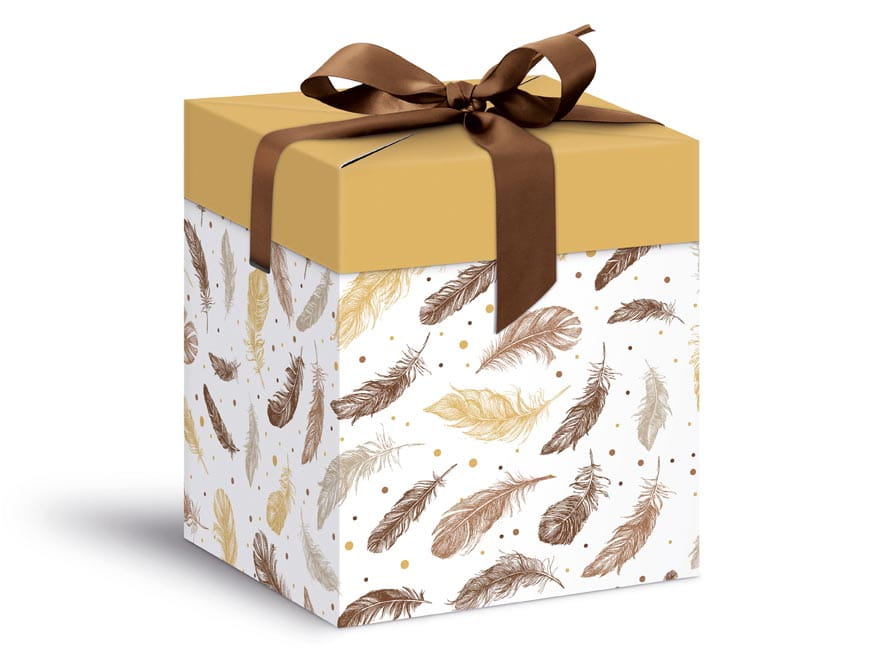 Ozdobne pudełko prezentowe w motyw piór – eleganckie opakowanie na kubek